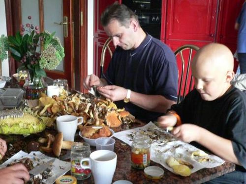A potem wspólne spotkania przy kuchennym stole, przepełnione obieraniem grzybów, przygotowywaniem słoików z zaprawami, „naszyjników” do suszenia, itp. Zresztą niemal codziennie udawało nam się raczyć przynajmniej częścią naszych zbiorów, jednym razem w postaci zupy grzybowej, innym – jajecznicy czy sosu. Było pyszne, a co najważniejsze - jadalne. Nawet prezenty dla naszych gospodarzy były dość tendencyjne – kosz pełen grzybów i słoiki z maślakami w zaprawie, zaopatrzone w etykietki autorstwa Maćka Kowalczyka: „zajefajne dzieciaki, dają Wam maślaki”.