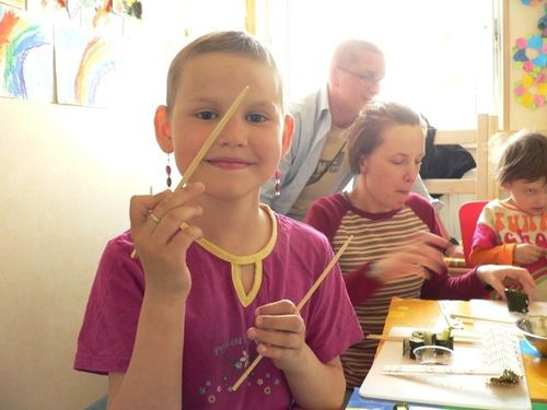 Dzieci z zapartym tchem słuchały opowieści o japońskich obyczajach, robiąc hosomaki (sushi zawijane w wodorosty) i uramaki (sushi z glonem w środku). Potem mali kucharze uczyli sie jeść przyrządzone samodzielnie potrawy pałeczkami, co okazało sie po raz kolejny najzabawniejszym punktem programu:)