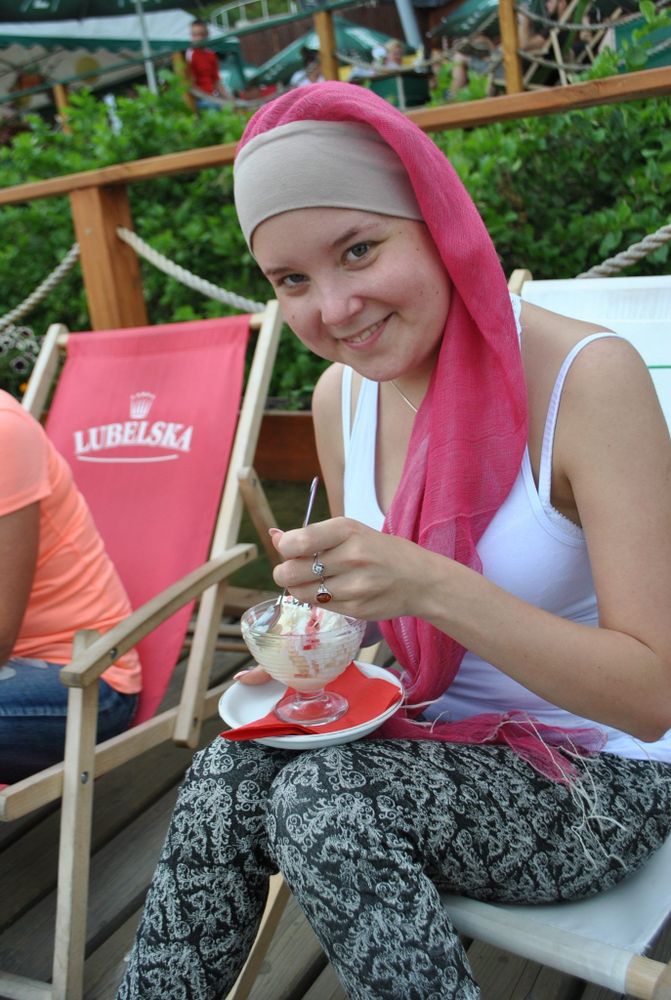 Natalka uwielbia kabarety i koniecznie chciała zobaczyć amfiteatr w Mrągowie, gdzie większość z nich występuje. Potem były pyszne lody nad samiutkim jeziorem. No i były też konie. Z lękiem patrzyłam jak wsiada na przepięknego rumaka. Dała radę. Choć ciągle jest słaba, w siodle trzymała się dzielnie. Myślę, że to też zasługa ludzi prowadzących Stadninę Pegaz w Nowych Kiejkutach. Stworzyli rodzinną atmosferę, Natalia bardzo szybko im zaufała. Czas wypełniały nam wspólne, pyszne posiłki na świeżym powietrzu, długie rozmowy z Panem Michałem, który cały czas był tuż, tuż, który umiał czytać między wierszami i wychodził na przeciw naszym oczekiwaniom. Odpoczęliśmy wszyscy. Nabraliśmy sił i mamy co opowiadać.