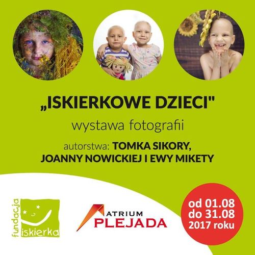 Od 1 do 31 sierpnia zapraszamy na wystawę "Iskierkowe Dzieci" w Atrium Plejada w Bytomiu. Ta wystawa jest także spotkaniem. Trzech fotografów, trzech rożnych spojrzeń i wrażliwości: TOMKA SIKORY mistrza wędrującego z aparatem po świecie od ponad 30 lat, JOANNY NOWICKIEJ fotografującej „iskierki” od 2008 roku i EWY MIKETY, mamy podopiecznej fundacji która przygodę z fotografią rozpoczęła w trakcie leczenia córki. To wyjątkowe spotkanie opowiedziane obrazem, wyobraźnią i magią światłoczułej materii.
