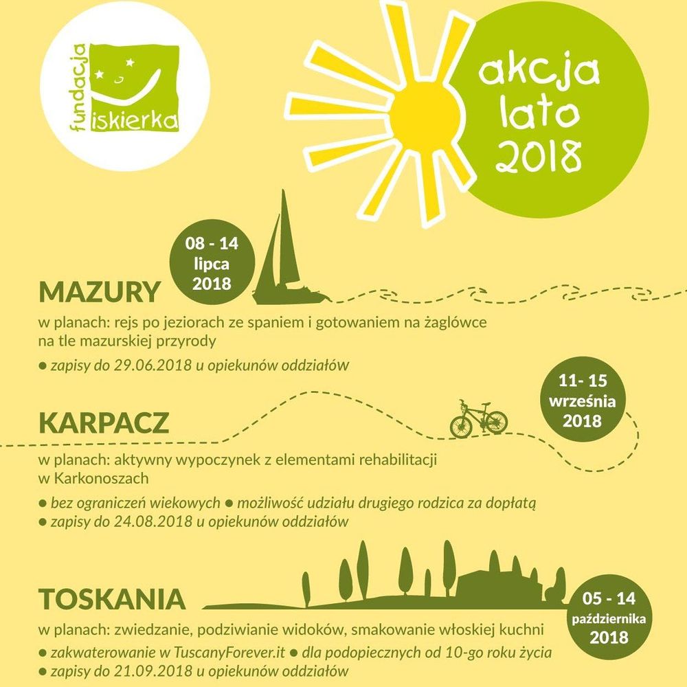 Wakacje to dla podopiecznych Fundacji ISKIERKA miesiące obfitujące w wiele wydarzeń, spotkań i atrakcji. Wśród nich m.in. Akcja Lato. To wyjazdy integracyjno-terapeutyczny mające na celu wzmocnienie psychologiczne dzieci z chorobą nowotworową oraz ich rodzin. Integracja podczas takich wycieczek jest niezbędnym elementem wsparcia, gdyż długotrwałe leczenie szpitalne jest w pełni podporządkowane chorobie dziecka.