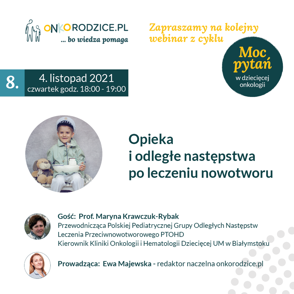 Cykl comiesięcznych webinarów pt.: “Moc pytań w dziecięcej onkologii” jest projektem w ramach portalu onkorodzice.pl. To spotkania online rodziców z lekarzami i specjalistami, którzy na co dzień pracują z dziećmi chorymi na nowotwory. Redaktor naczelna portalu Ewa Majewska porusza zarówno tematykę medyczną, jak i różne obszary związane z onkologią: wsparcie psychologiczne, rehabilitacja, dietetyka i różne formy terapeutyczne. Dla tych, którzy nie mogli wziąć bezpośredniego udziału, na portalu są udostępnione nagrania.