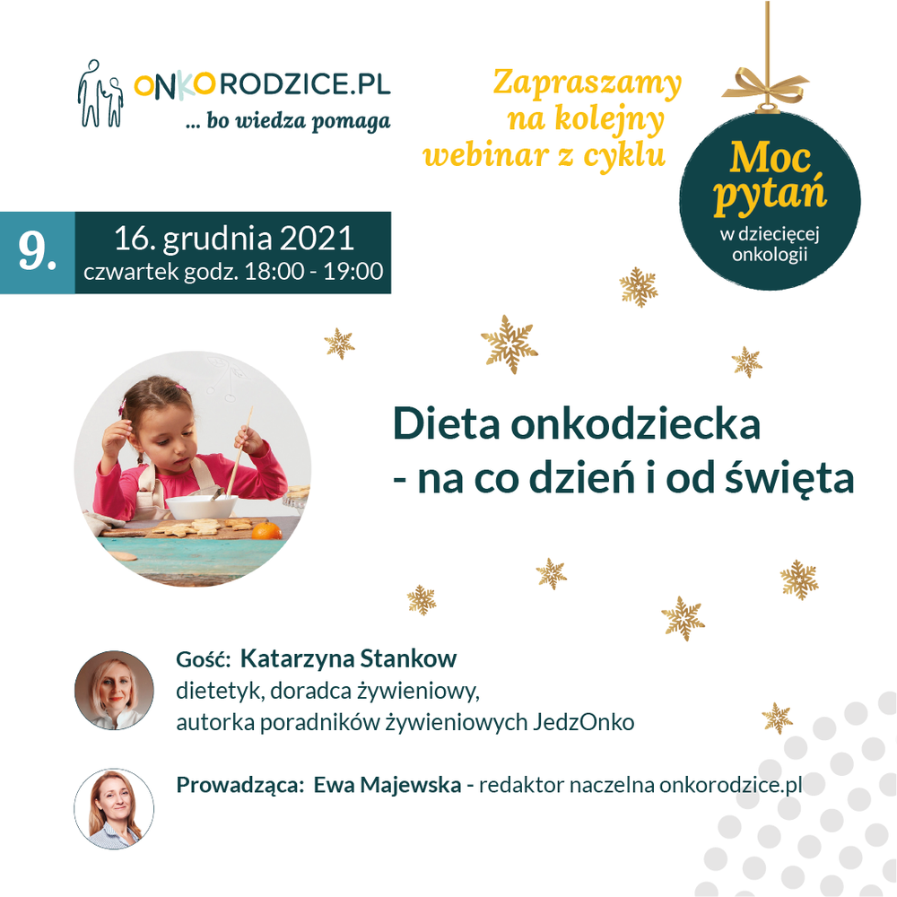 16 grudnia zaprosiliśmy Was na spotkanie z naszą dietetyczką Katarzyną Stankow, która opowiedziała na co uważać przygotowując dziecku posiłek, po jakie produkty warto sięgać, a jakich unikać oraz jak dostosować dietę w przypadku pojawienia się różnych dolegliwości. Pokazaliśmy jak dieta dziecka chorego onkologicznie może być kolorowa i smaczna. Podpowiadaliśmy także jakie świąteczne potrawy można przygotować.