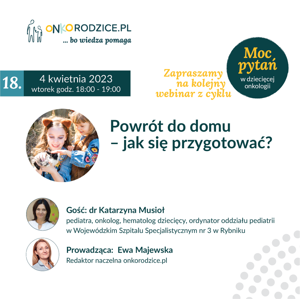 4 kwietnia odbył się webinar z dr Katarzyną Musioł (pediatra, onkolog, hematolog dziecięcy, ordynator oddziału pediatrii w Wojewódzkim Szpitalu Specjalistycznym nr 3 w Rybniku, przez 20 lat pracowała na oddziale onkologii i hematologii w klinice pediatrii w Katowicach), która wyjaśniła nam jak się przygotować na wyjście ze szpitala, aby czas w domu spędzić przyjemnie, bezpiecznie i zminimalizować konieczność nagłych, nieplanowanych hospitalizacji.