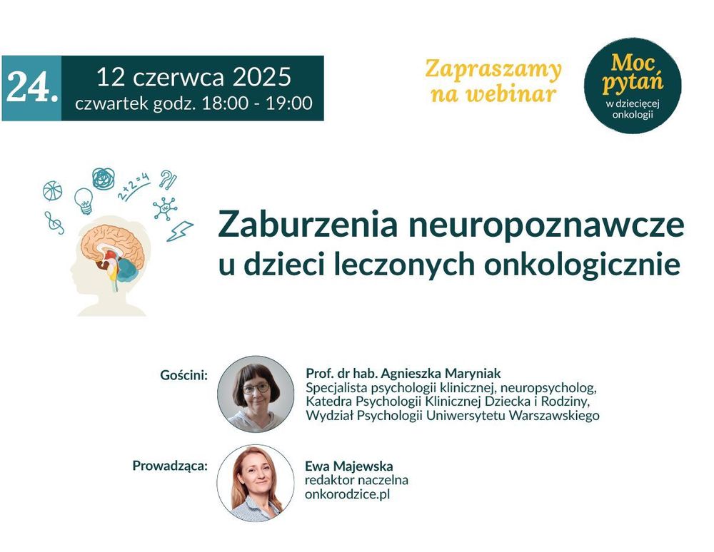 W imieniu portalu Onkorodzice.pl zapraszamy do obejrzenia zapisu webinaru „Zaburzenia neuropoznawcze u dzieci leczonych onkologicznie” z prof. dr hab. Agnieszka Maryniak, która specjalizuje się w pracy z dziećmi z chorobami układu nerwowego, a także z zaburzeniami neurorozwojowymi, w tym przede wszystkim z zaburzeniami rozwoju języka.
