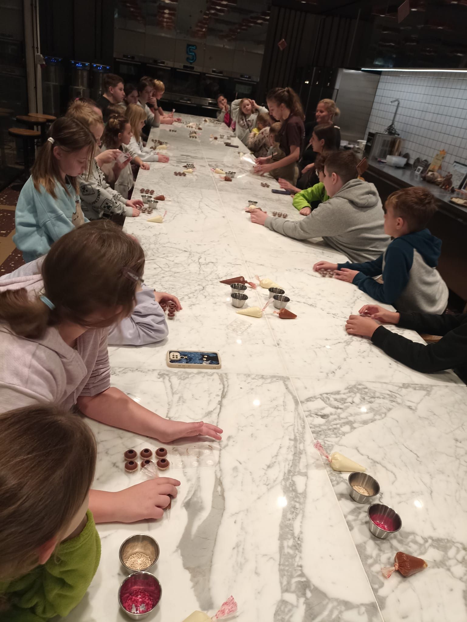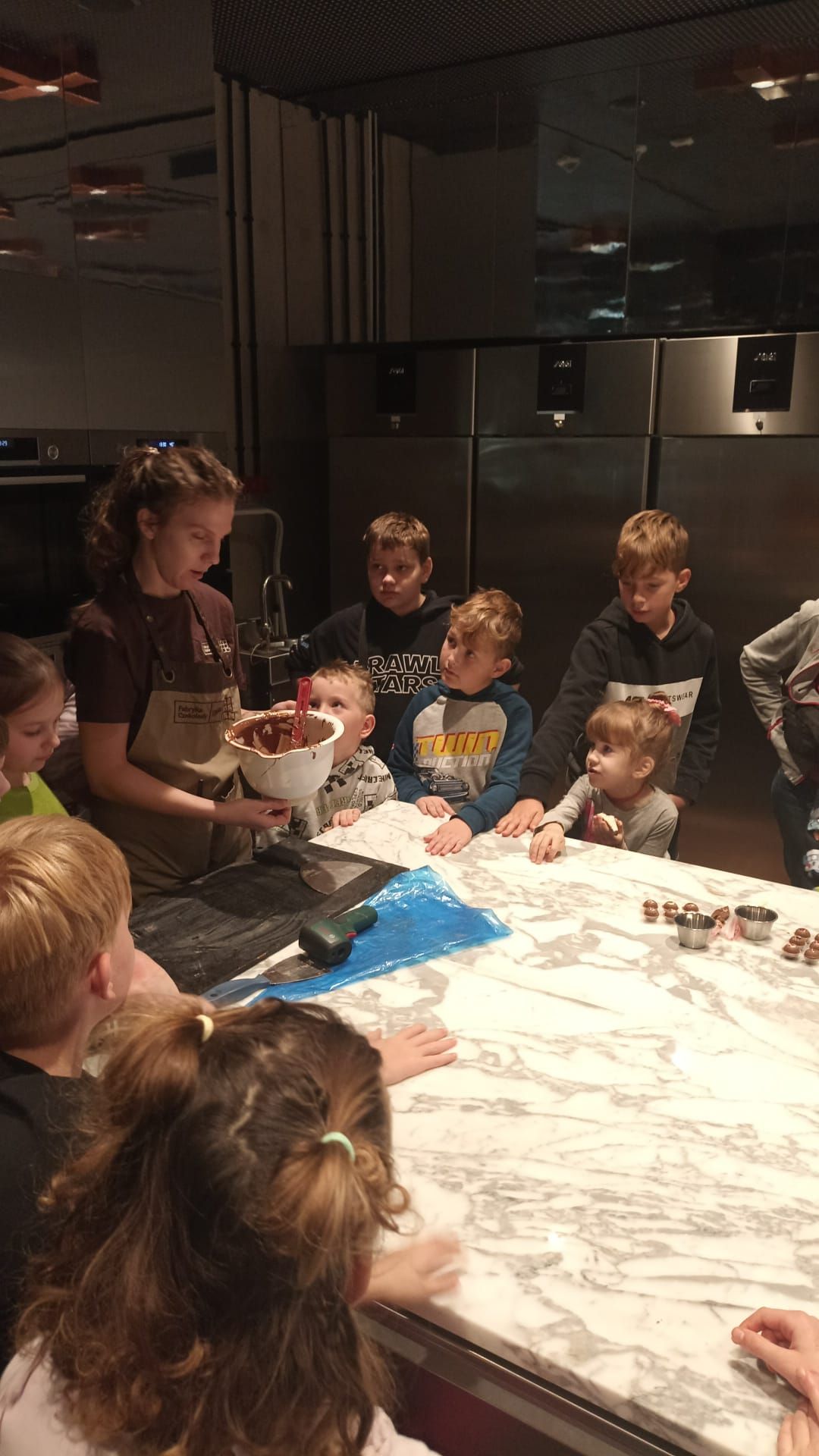 Popołudniu wyruszyliśmy do słynnej fabryki czekolady Wedla. Tam dzieci wzięły udział w wyjątkowych, słodkich warsztatach, podczas których własnoręcznie tworzyły przepyszne pralinki. Zapach czekolady unosił się wszędzie, a kreatywność małych cukierników nie miała granic!
