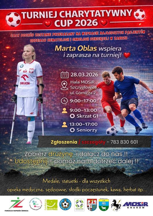 28 marca 2026 r. odbędzie się charytatywny turniej piłki nożnej dla najmłodszych oraz seniorów. Wydarzenie zaplanowane jest w godzinach 9:00–18:00 na hali MOSiR w Szczygłowicach. Całość inicjatywy ma charakter w 100% charytatywny.